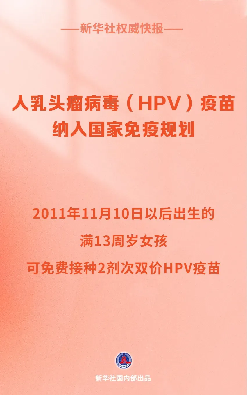 今天(10月30日),国家疾控局、国家卫生健康委等七部门发出通知,经国务院同意,将人乳头瘤病毒疫苗也就是HPV疫苗纳入国家免疫规划,自2025年11月10日起,组织各地为2011年11月10日以后出生的满13周岁女孩免费接种2剂次双价HPV疫苗(间隔6个月)。